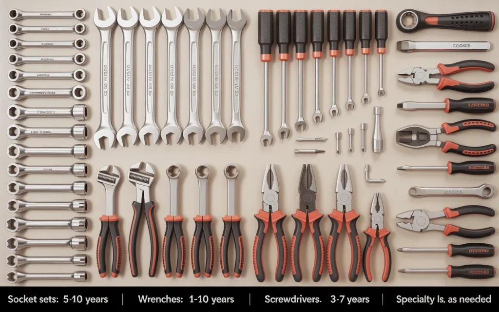 If you use your tools daily in a professional setting, expect to replace high-use tools like ratchets and sockets every two to five years. Torque wrenches should be calibrated yearly. Power tools may last longer but watch for motor wear and battery decline.