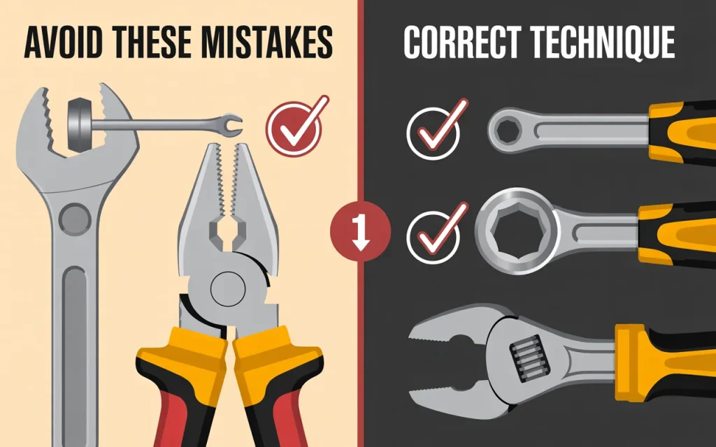 | Using pliers instead of a wrench | Trying to cut corners | Damaged fastener heads, loss of grip, tool damage |
